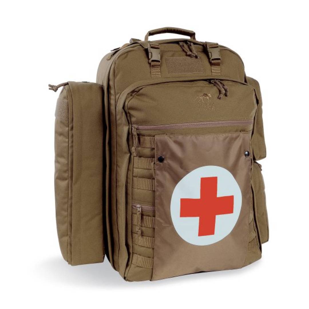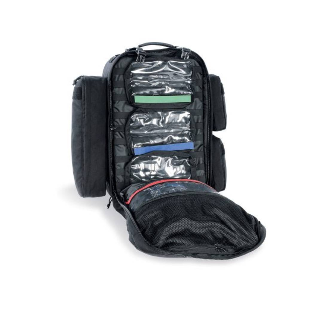 Large, generously fitted-out first aid backpack. The side pockets are detachable, while the padded interior compartment has adjustable compartments. The backpack also has a removable panel with detachable, labelled clear pockets, MOLLE system and elastic loops.
