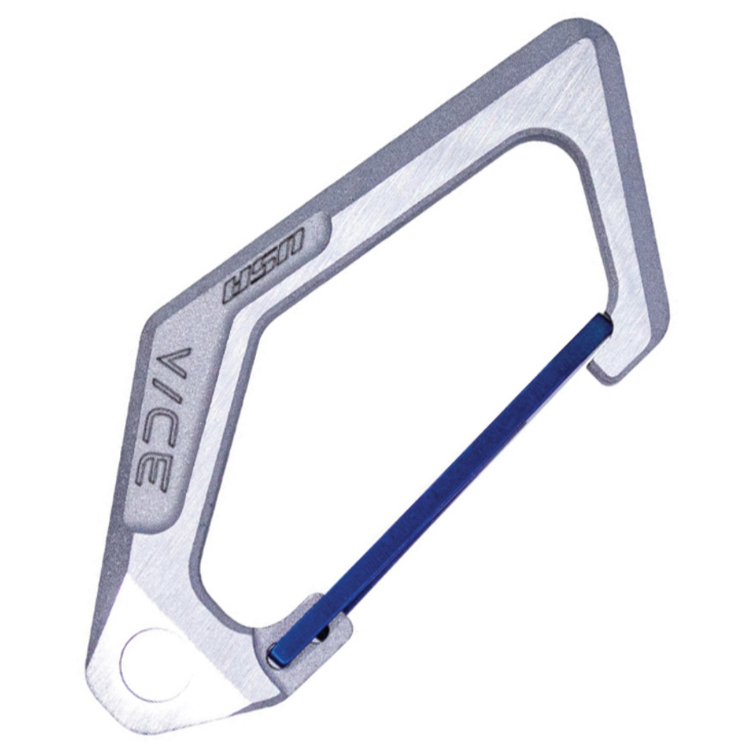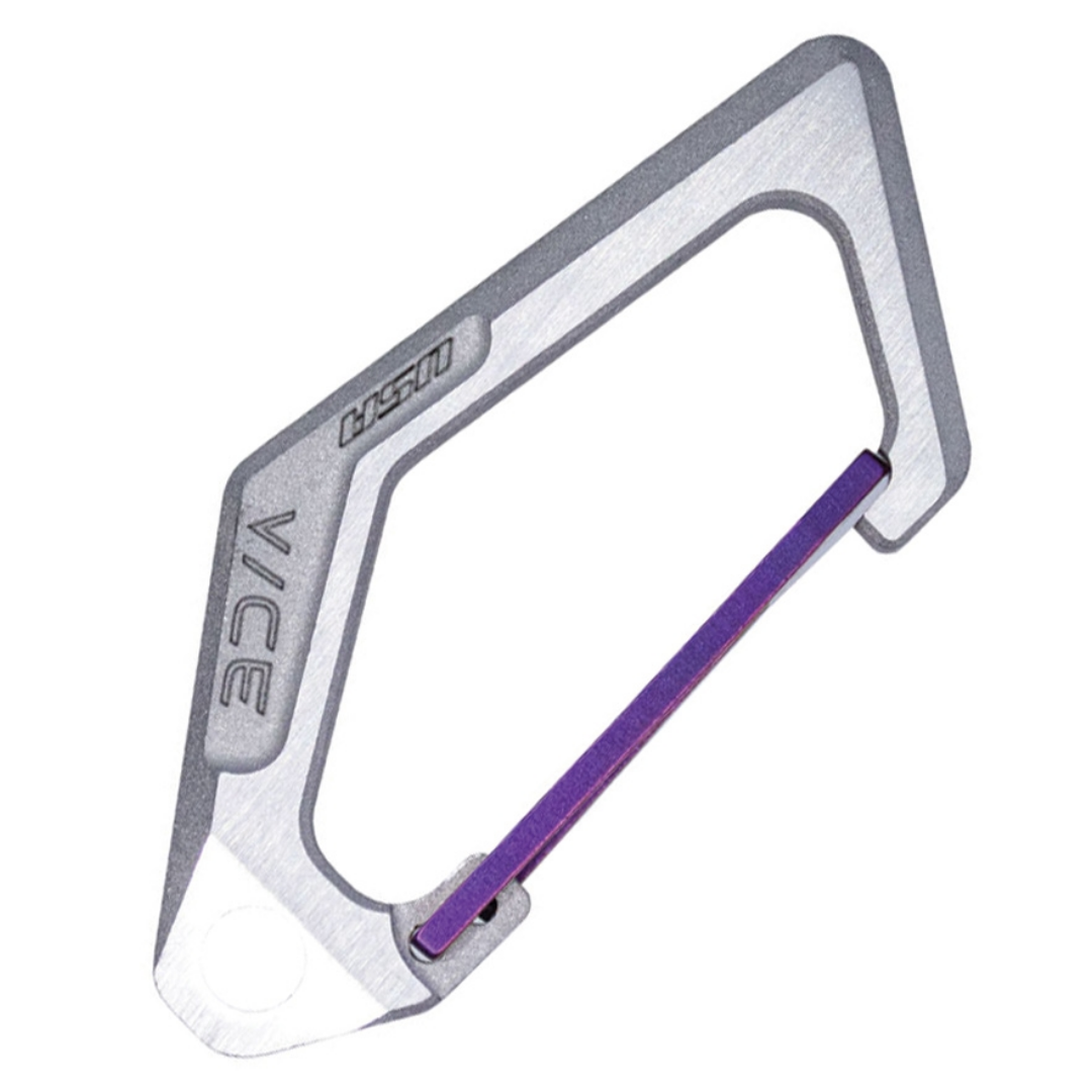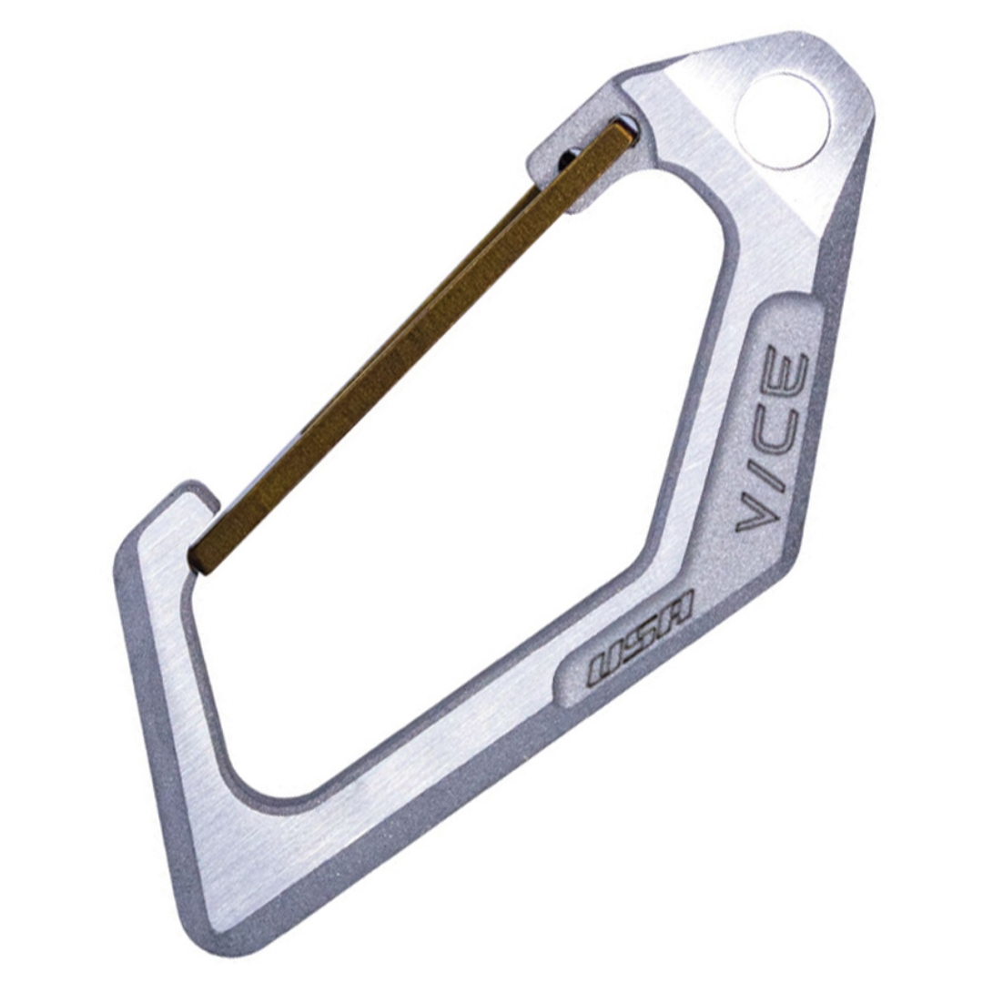 2.75″ overall. Sandblast finish titanium construction. Large enough to fit key fobs and any accessories you need to keep together. Lanyard hole. Not for climbing. Vice Hardware collaboration.