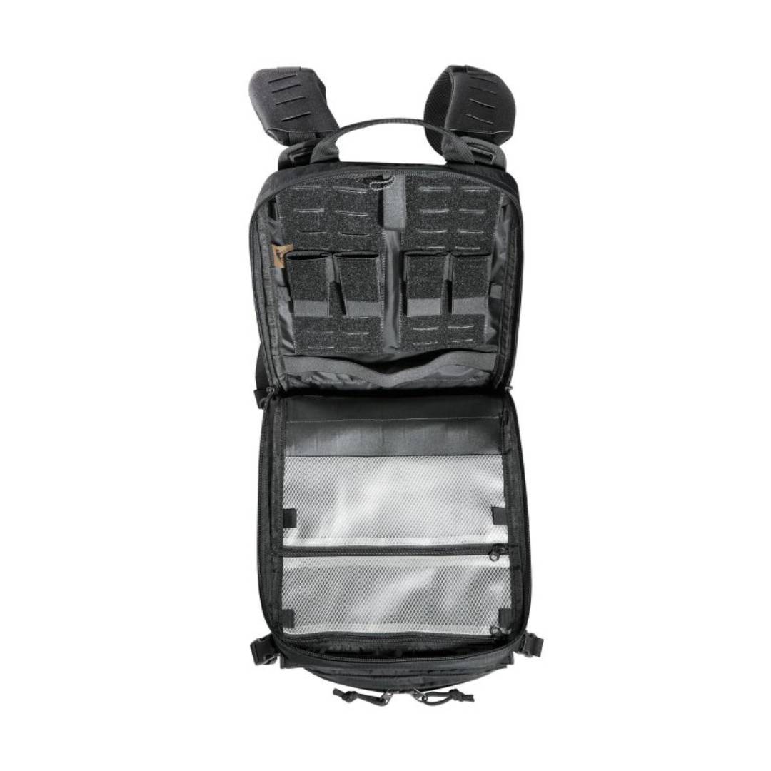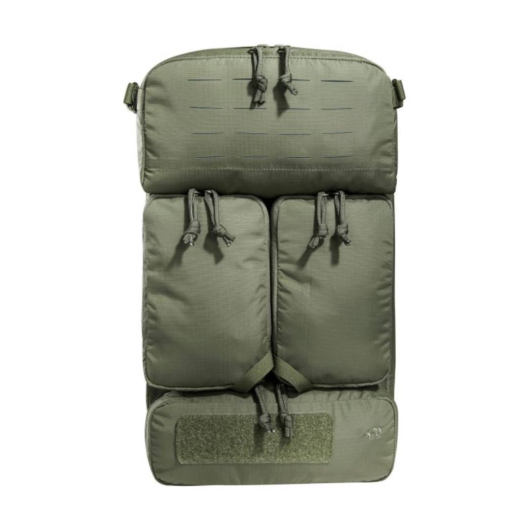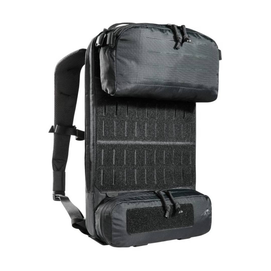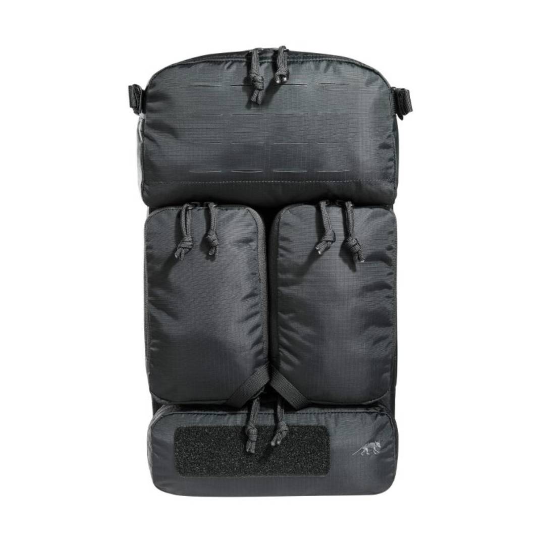 Light, tactical deployment backpack for modular use. The materials used for this deployment backpack are very light, making it super easy to handle. It has a flat main compartment that is hydration system compatible and the back panel is fitted with MOLLE hook-and-loop for customizable loading of your gear. The upper front pocket of the backpack is a flip-top behind which you can attach a magazine holder (three M4 magazines or 4 pistol / MP7 magazines, included with purchase). Both middle front pockets are removable and behind each is a MOLLE hook-and-loop surface. Both the TT Tac Pouch 12 (Item 7862) or the TT 2 SGL Backup Mag Pouch M4 (Item 7811) can be attached to the lower front pocket. The backpack has a MOLLE reverse system on the back so you can integrate it into a plate carrier. You can also use an adapter to attach it to plate carriers.