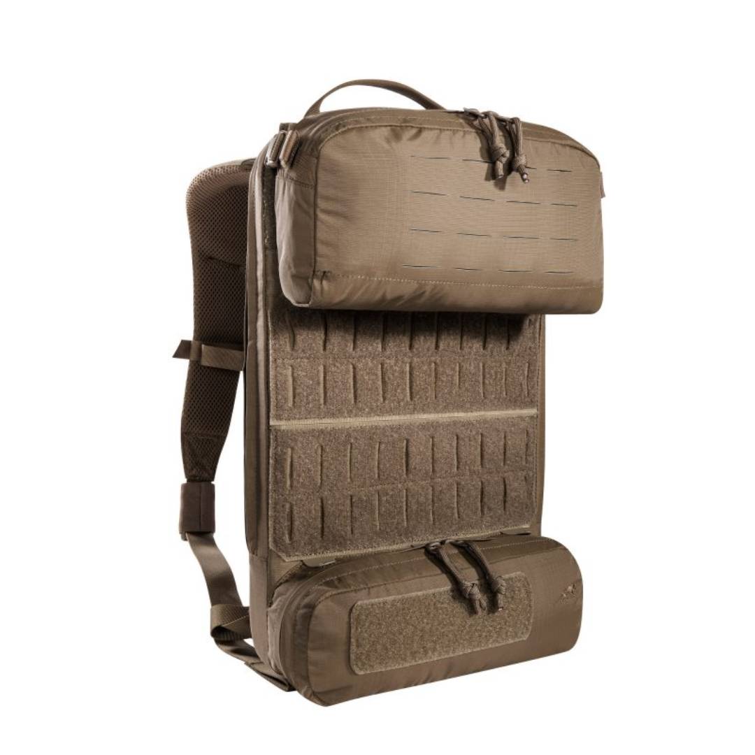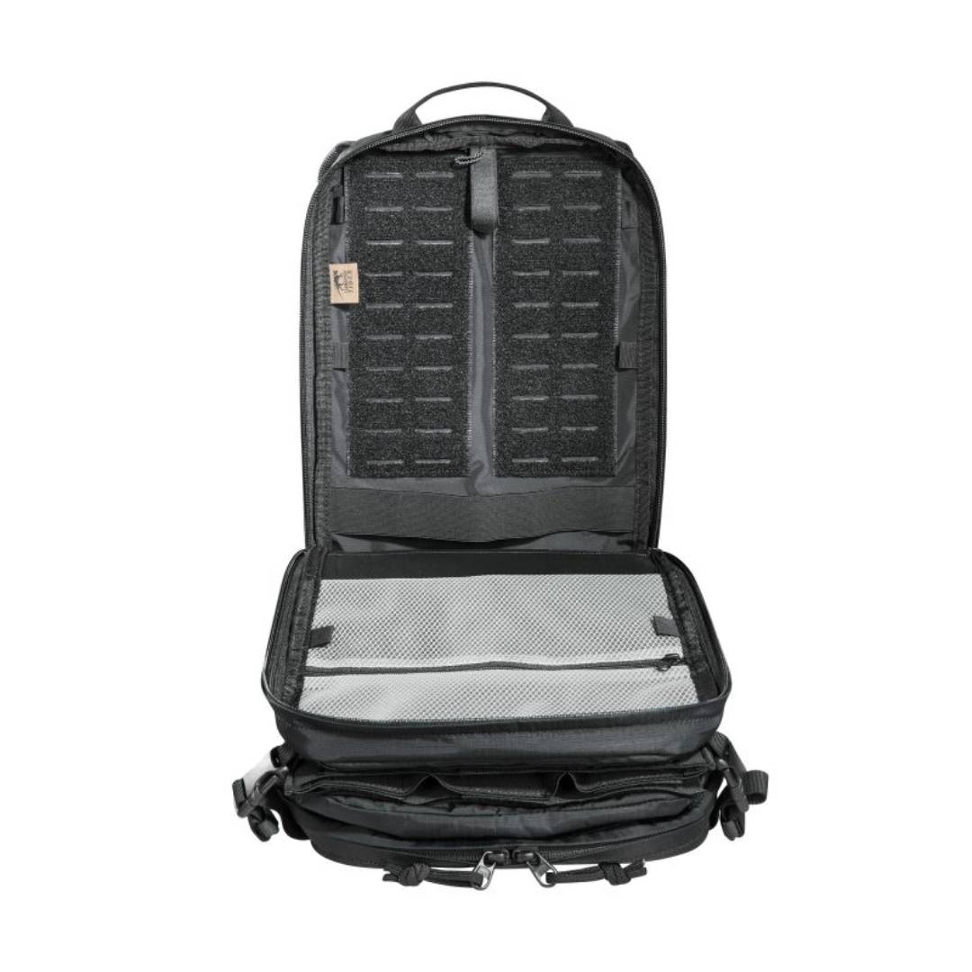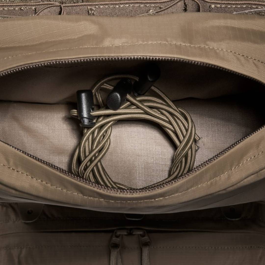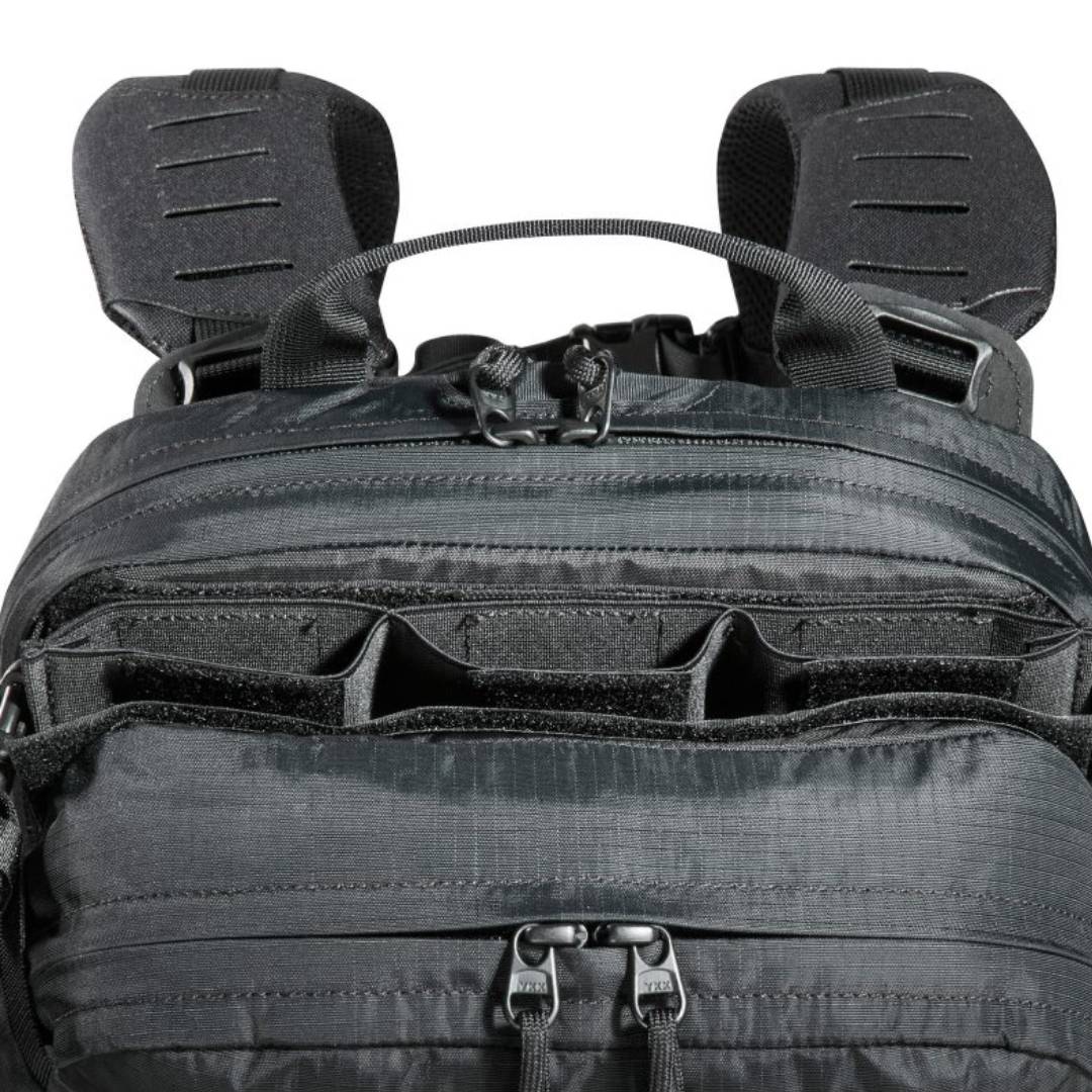 Light, tactical deployment backpack for modular use. The materials used for this deployment backpack are very light, making it super easy to handle. It has a flat main compartment that is hydration system compatible and the back panel is fitted with MOLLE hook-and-loop for customizable loading of your gear. The upper front pocket of the backpack is a flip-top behind which you can attach a magazine holder (three M4 magazines or 4 pistol / MP7 magazines, included with purchase). Both middle front pockets are removable and behind each is a MOLLE hook-and-loop surface. Both the TT Tac Pouch 12 (Item 7862) or the TT 2 SGL Backup Mag Pouch M4 (Item 7811) can be attached to the lower front pocket. The backpack has a MOLLE reverse system on the back so you can integrate it into a plate carrier. You can also use an adapter to attach it to plate carriers.